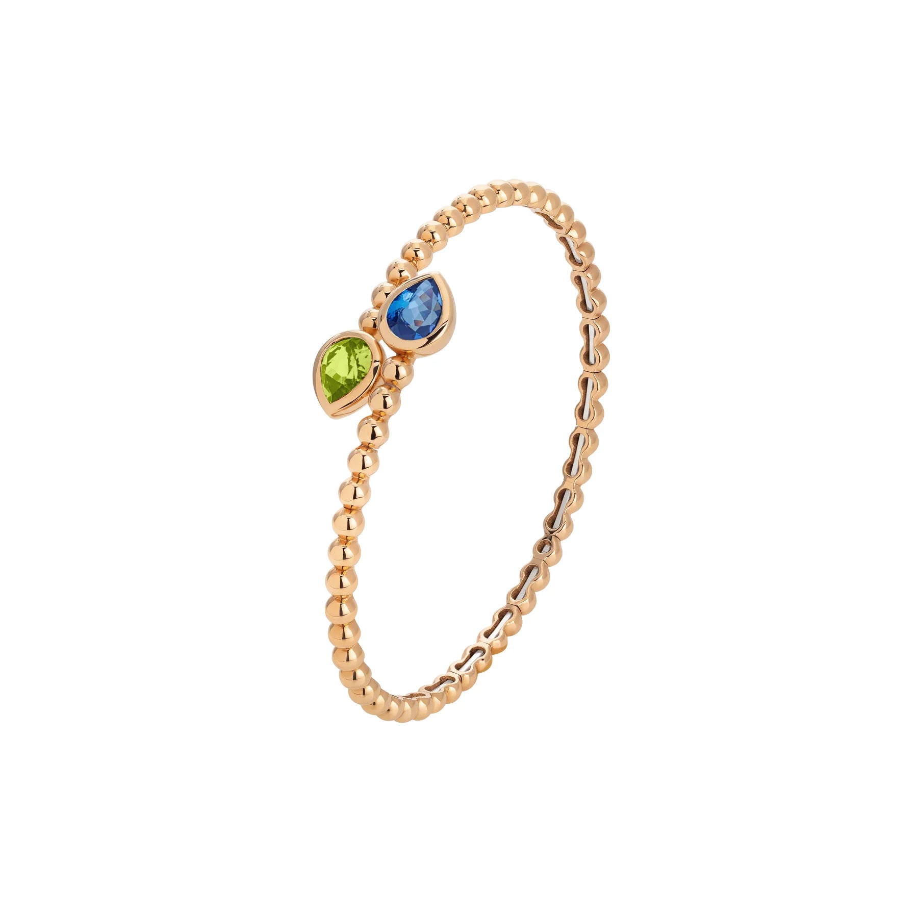 Rigid Twist Flexible Bangle in Rose Gold with Peridot and Contrarié Tanzanite. Tanzanite 1 x 1.20. Peridot 1 x 1.20. Weight 16 grams. Size Small (15.8cm), Medium (16.5cm), Large (17.8cm)