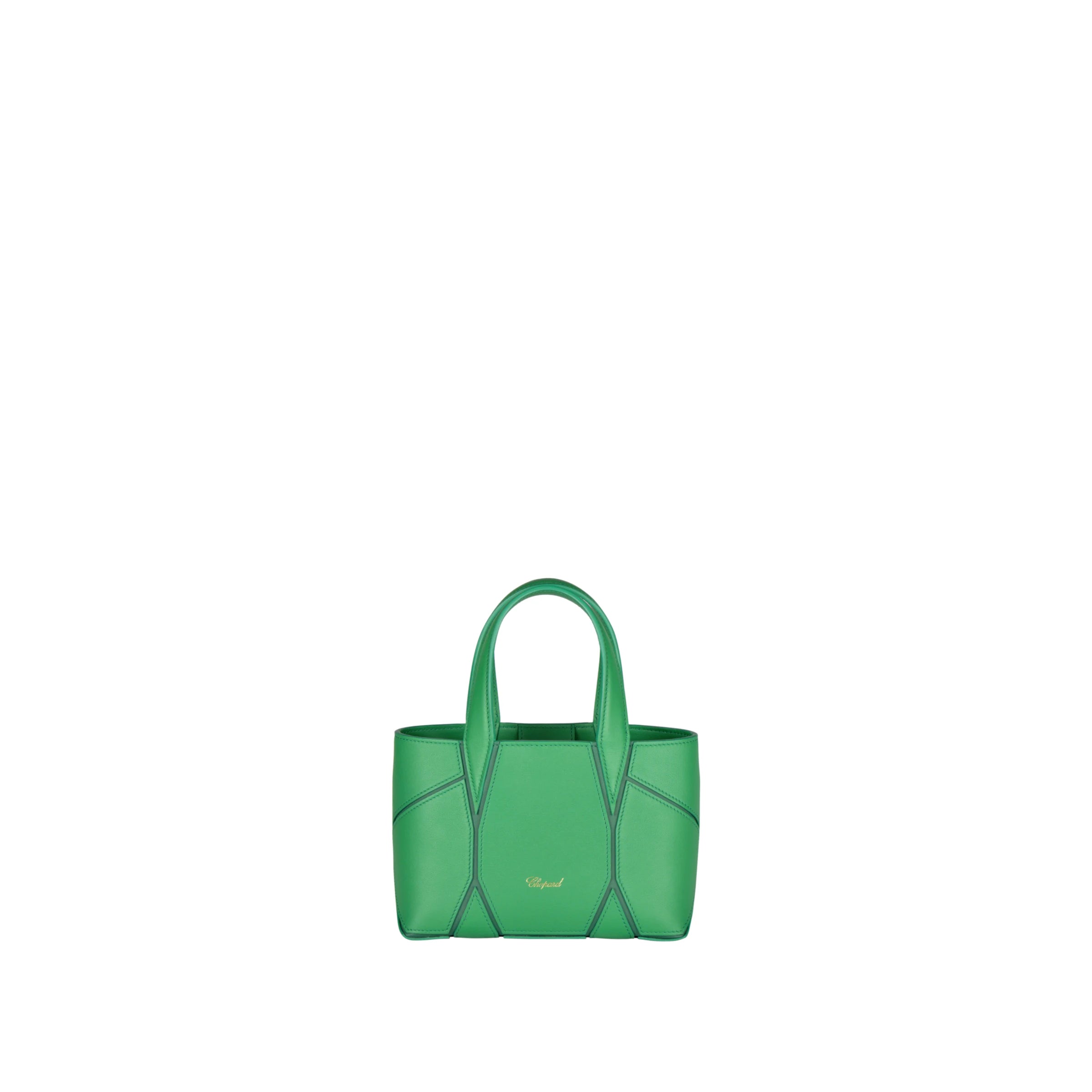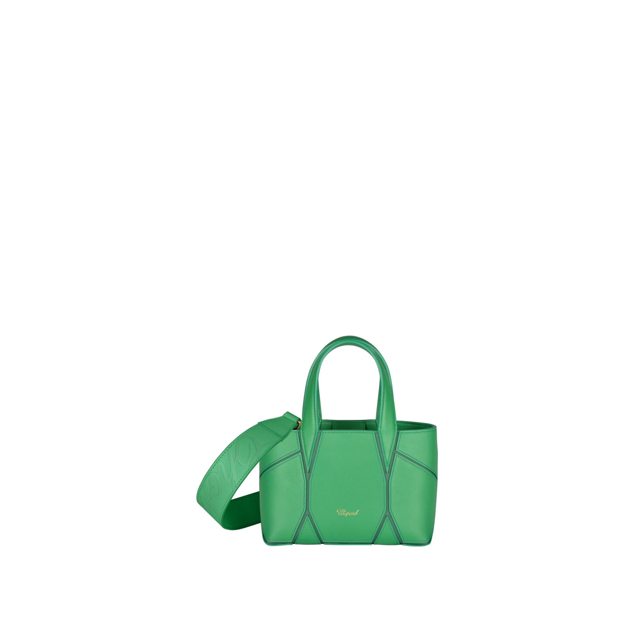 Lightweight and sophisticated, the Diamond tote leather micro bag reveals its pure lines through a magnificent set of bright green calfskin inserts whose design evokes the facets of a diamond. Its compact size means it can hold just essentials. This luxury women's bag can be hand-held or worn over the shoulder thanks to a wide, detachable and adjustable leather shoulder strap embossed with the iconic Chopard logo.