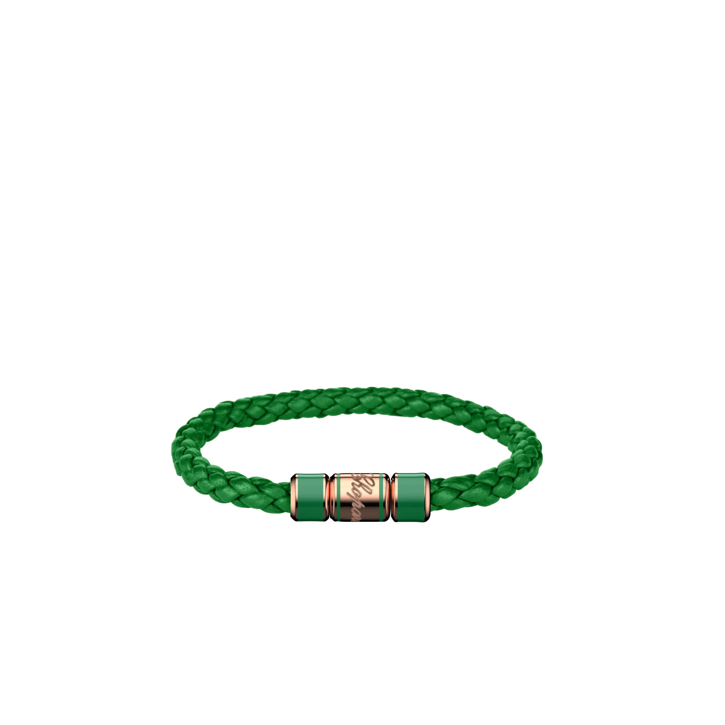 The Signature bracelet in green woven lamb leather is as captivating as it elegant. Finely engraved with the Chopard logo, the pink gilded and patent green metal clasp adds a touch of sophistication to this discreetly luxurious gem. Symbol of attachment, friendship or love, this is an essential piece to enhance a look that is both chic and casual.