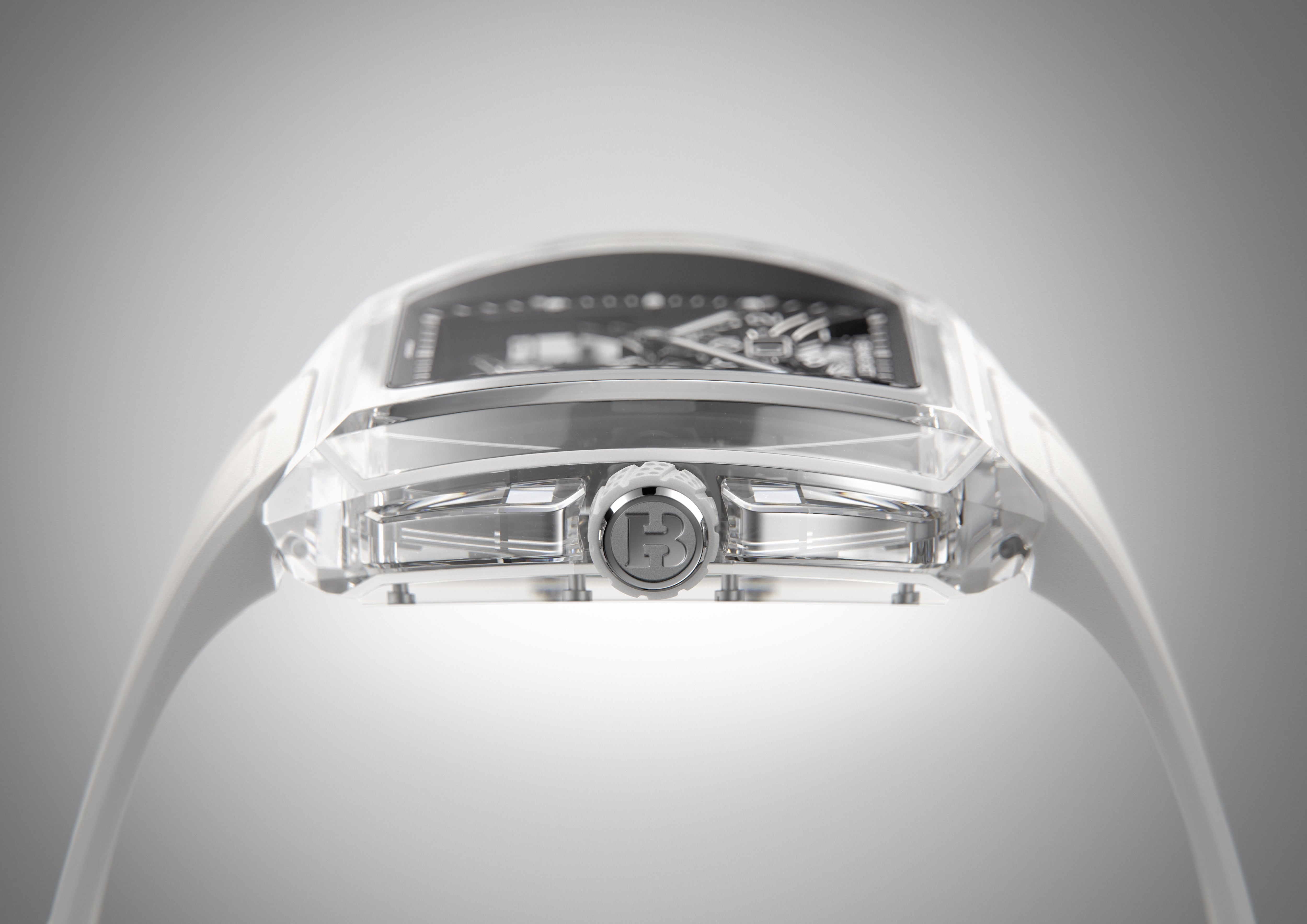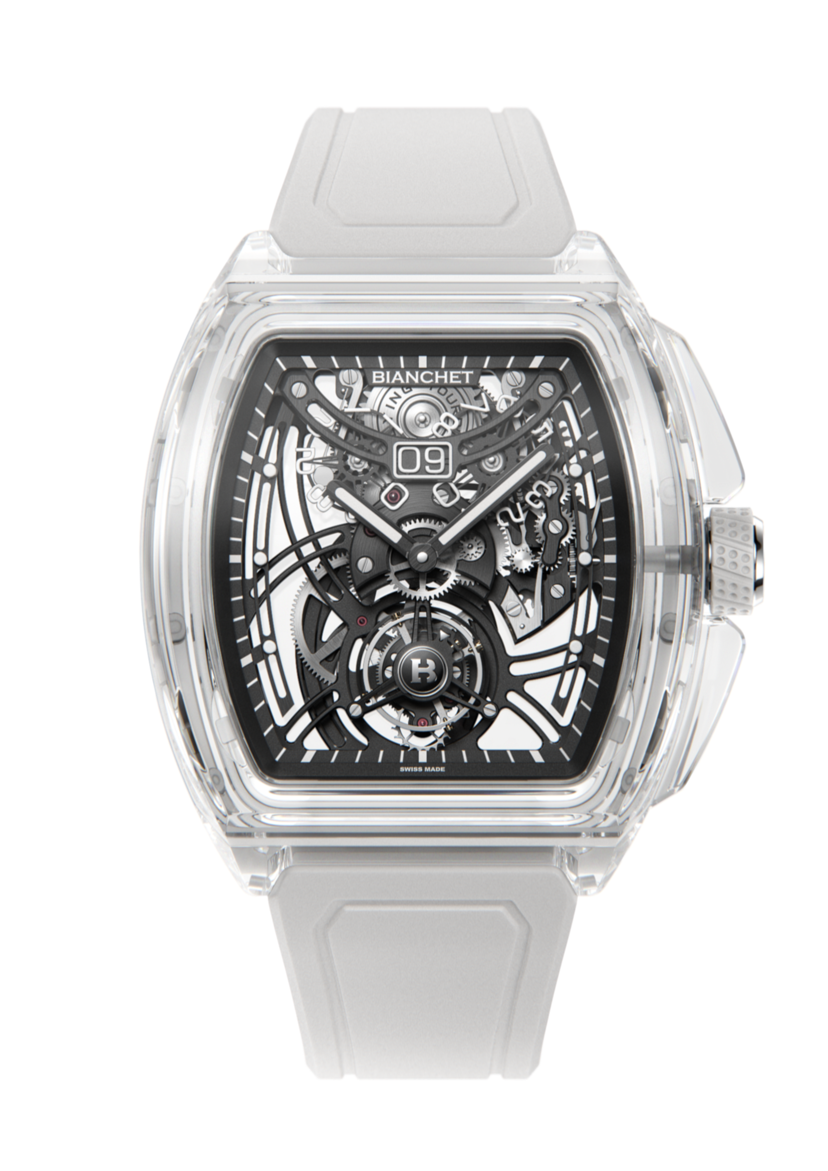 A masterpiece of transparency and refinement, the Flying Tourbillon Grande Date Sapphire Edition reveals the intricate architecture of Bianchet's in-house movement, designed and arranged according to the timeless principles of the golden ratio 1.618. The case embraces the light, allowing it to dance across the meticulously hand-finished movement components, creating an interplay of shadows and reflections that is as captivating as it is elegant.