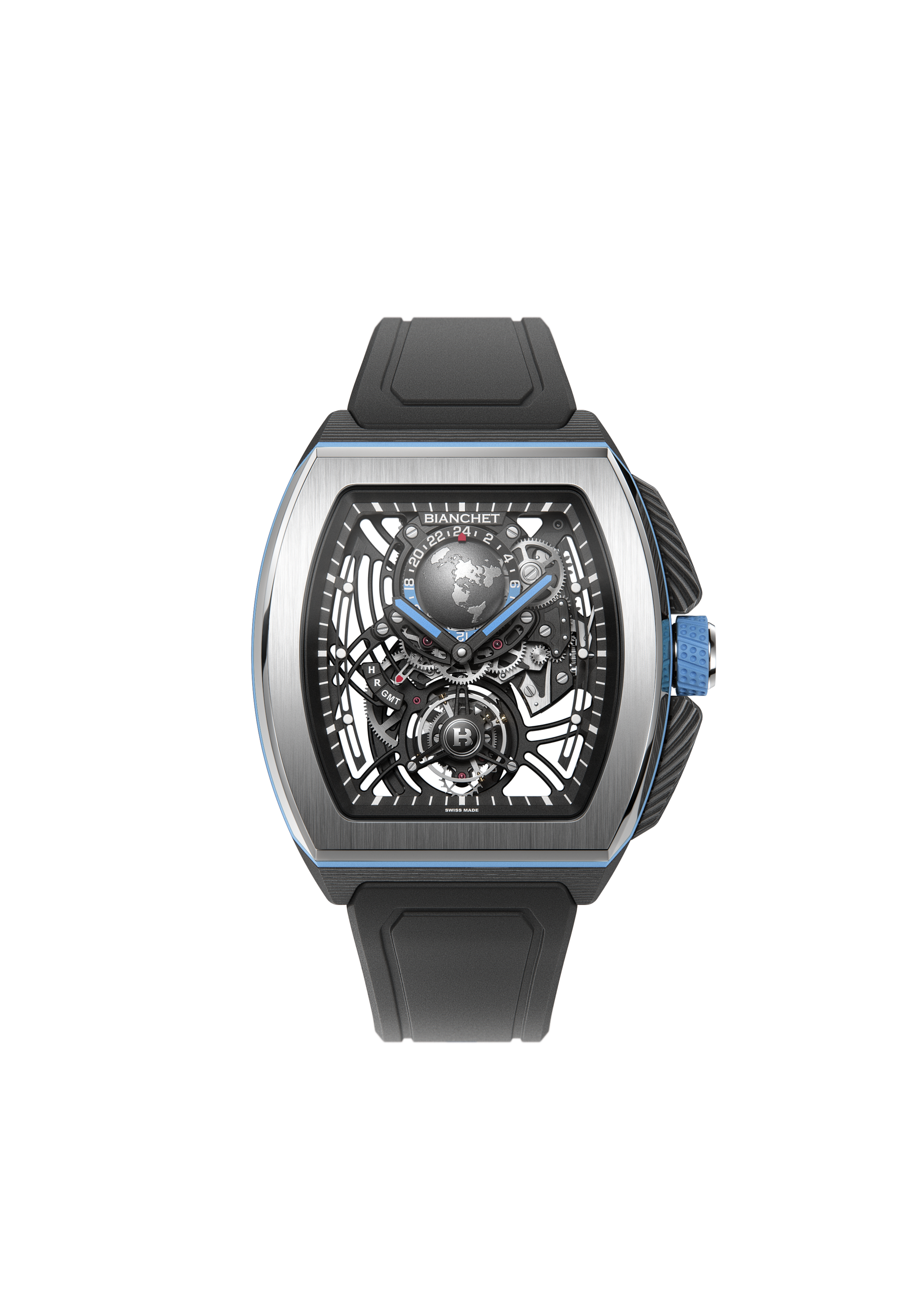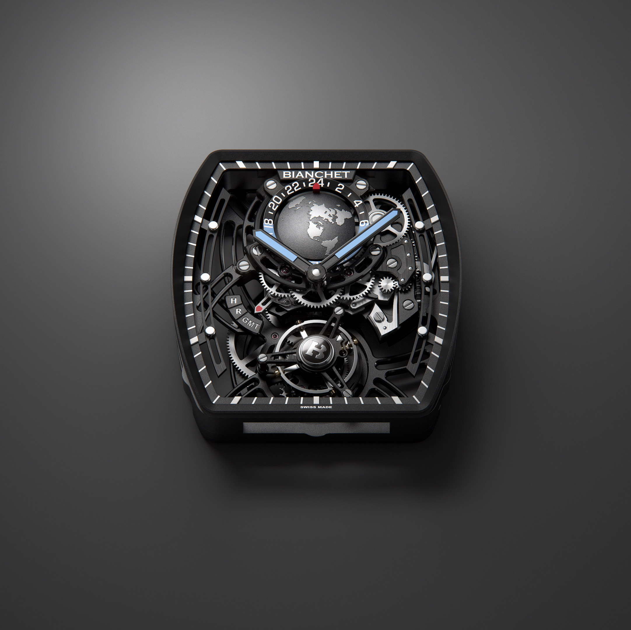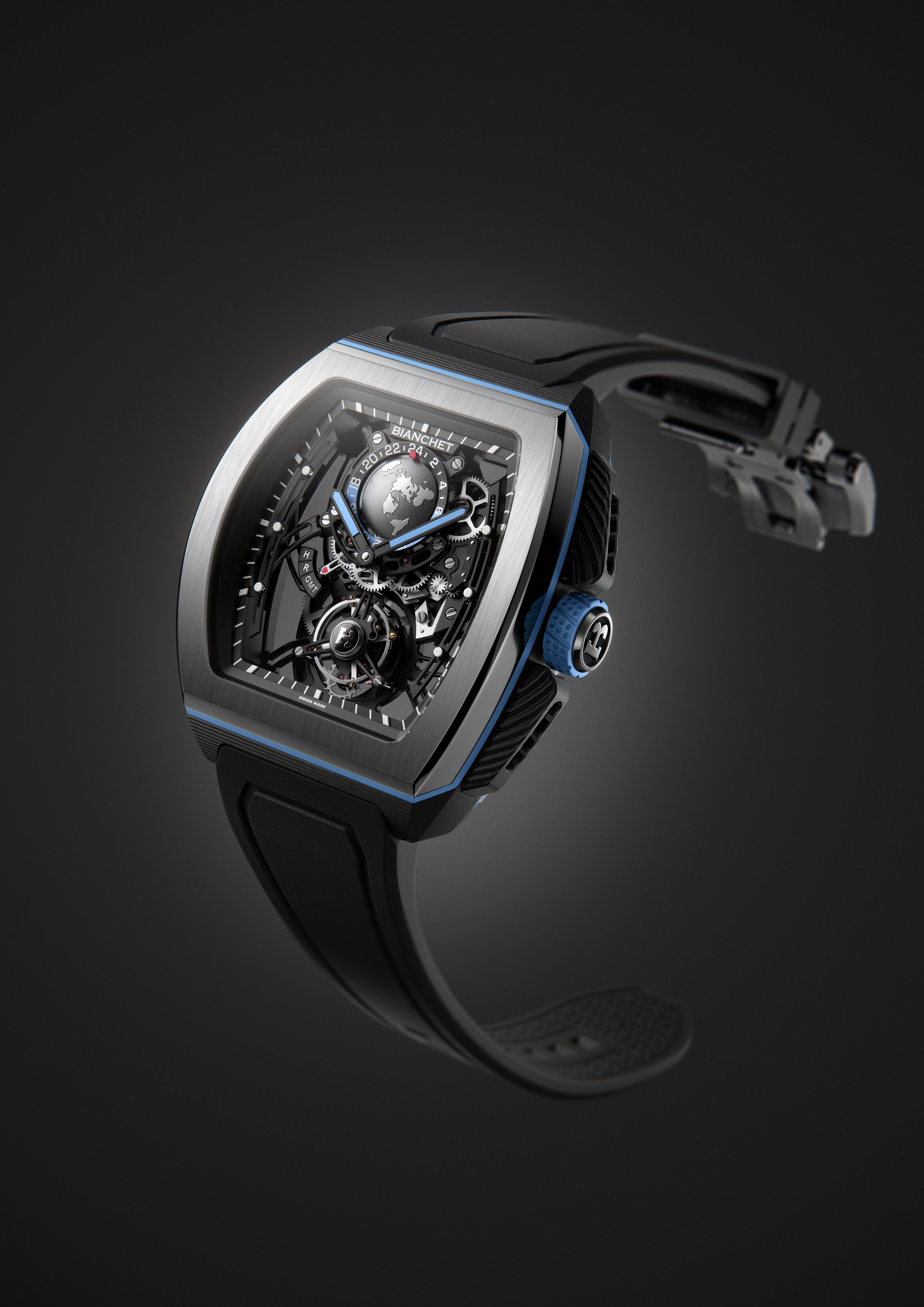 Movement Flying Tourbillon 60 seconds, with a GMT complication and function selector. Every movement is finished by hand and assembled in-house.