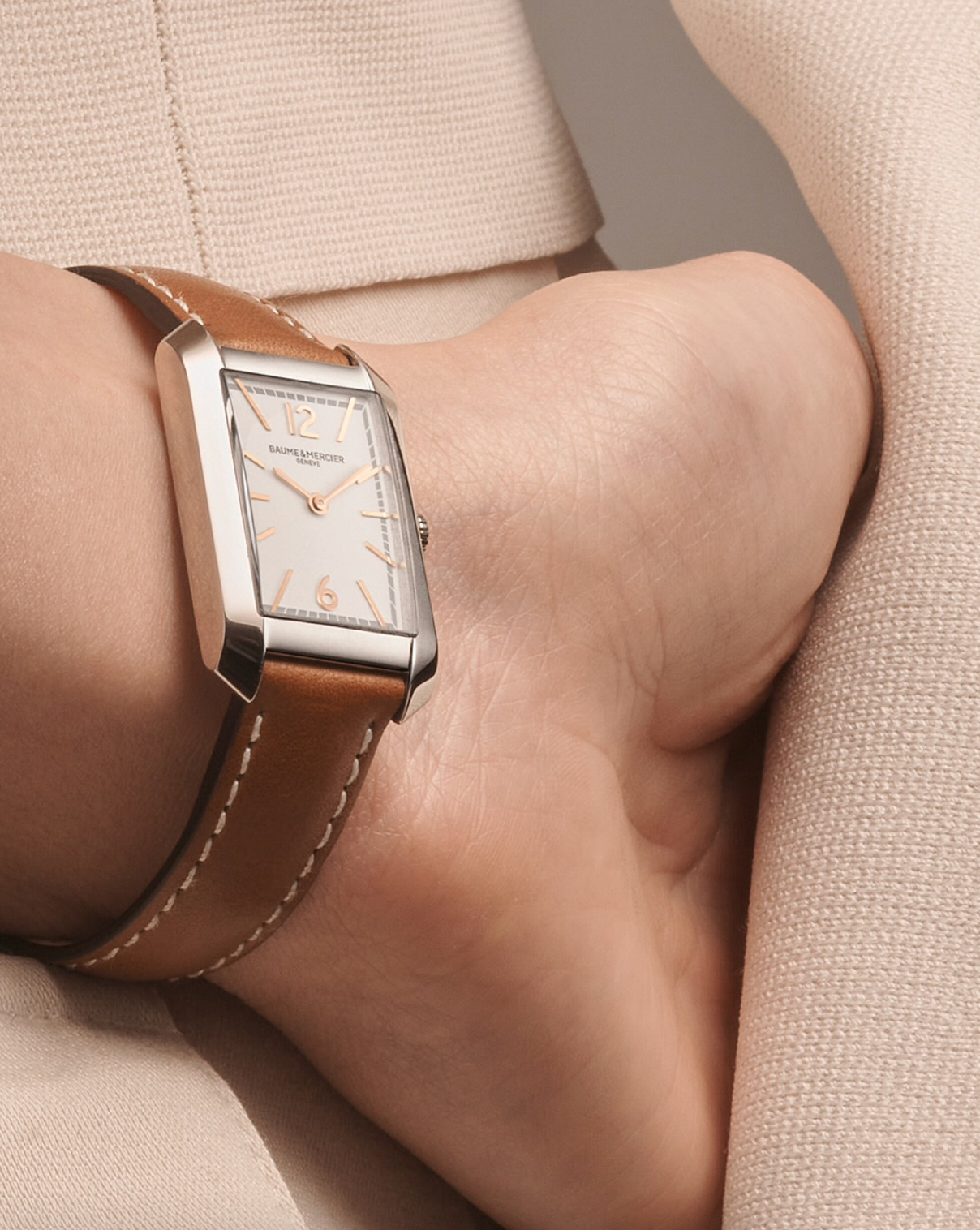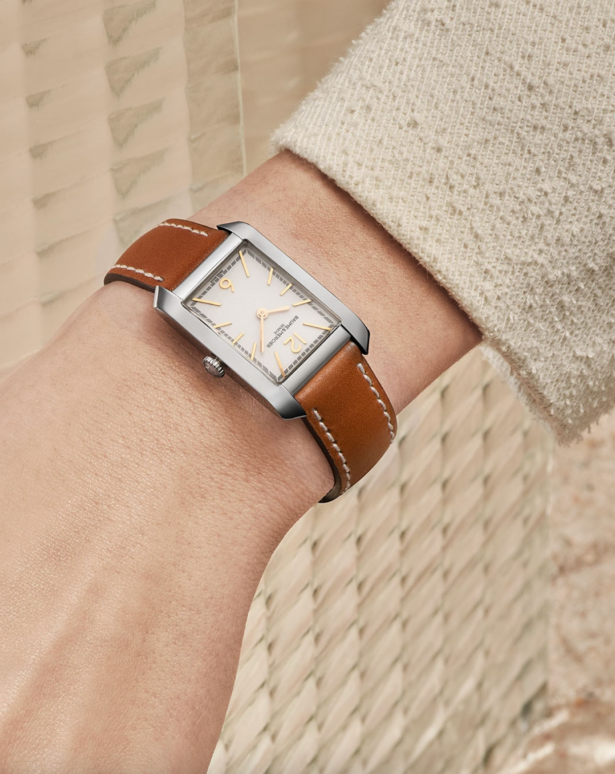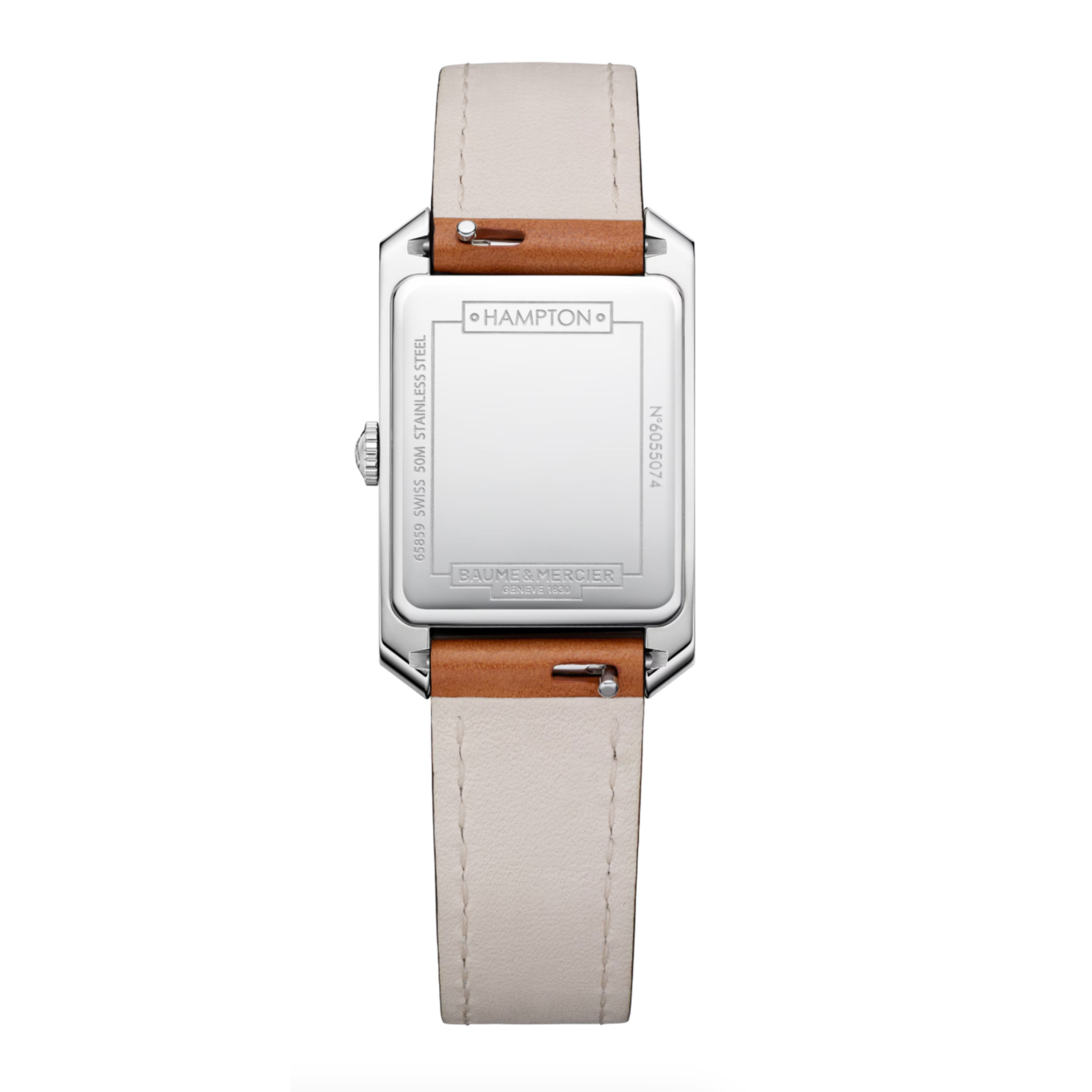 A classic rectangular watch for women, this Hampton wristwatch features a pure silver-coloured dial with the elegance of gilt sword-shaped hands and gilt Arabic numerals at 6 and 12 o’clock. It comes with a light brown calfskin strap with beige stitching.