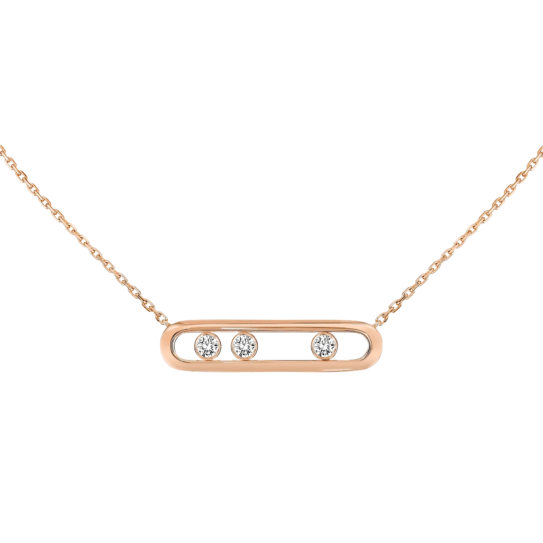 Once left behind, the yellow gold has been coming back for two years. It particularly suits the pretty matt and tanned skins, enlighting them with their amazing solar color. This 18 carat yellow gold diamond necklace, fully handcrafted, and set with three 0.08 carat brilliant cut diamonds in motion is part of the Move collection, icon of Messika luxury jewelry House. Its modern design, the chain, the curves of the precious and feminine cage and the three diamonds in motion enlighting every moments feature this IT jewel. Perfect to embody a precious moment, the Move pink gold diamond necklace will charm the bold women in search of a signature jewel. Fall for this diamond necklace as original as elegant, a perfect pink gold diamond jewel for women to wear at any occasion.