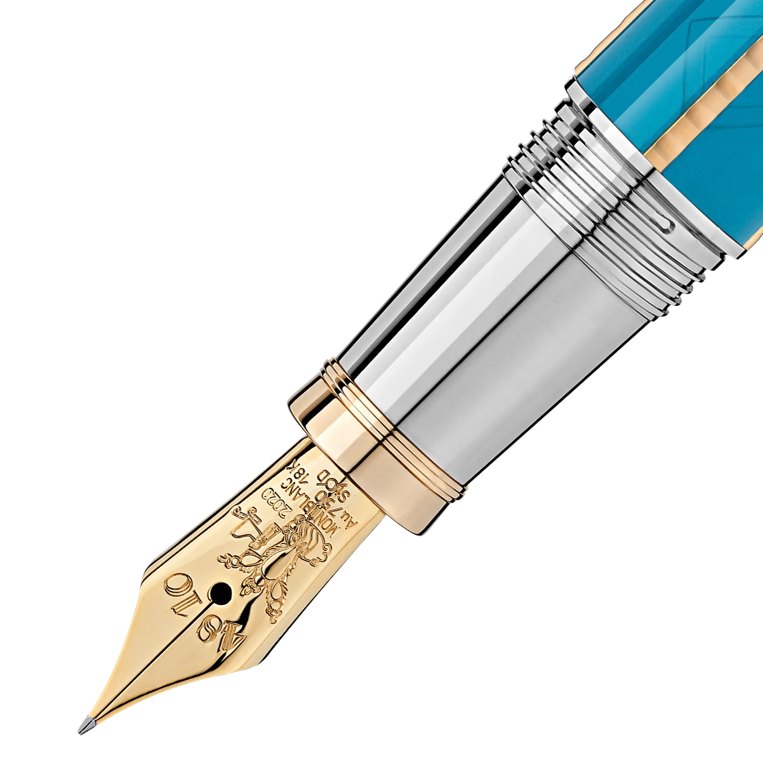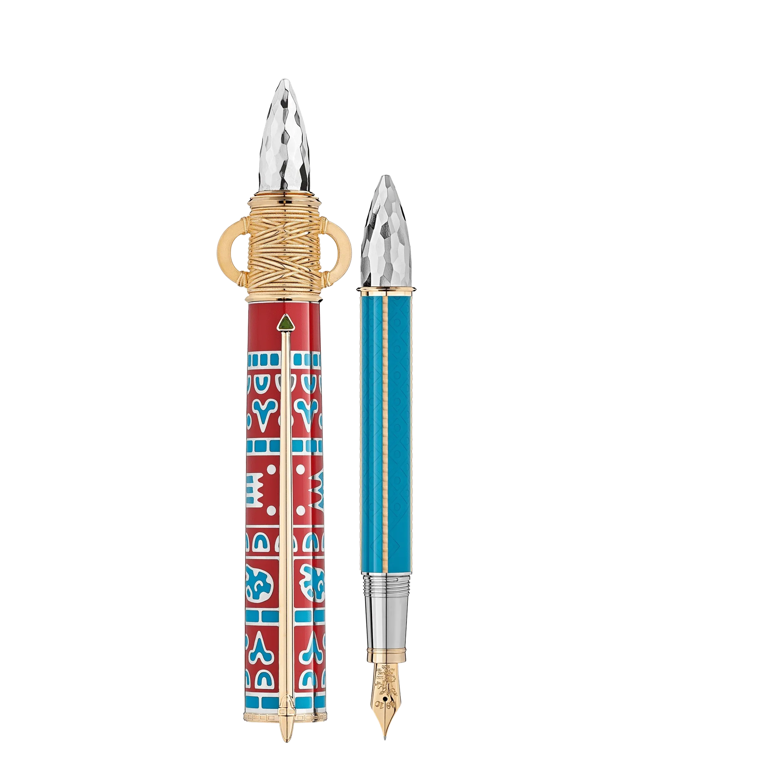 Moctezuma I was crowned ruler of the great Aztec Empire in 1440, thereby ushering in the golden age of the Aztecs. During his reign, he shaped the image of the Aztec state that we are familiar with today – a state rich in culture and mythology. The capital city Tenochtitlán, today’s Mexico City, blossomed under his rule. The Montblanc Patron of Art Homage to Moctezuma I Limited Edition 4810 with champagne-tone gold-coated fittings is dedicated to this supreme ruler of one of the most special cultures in world history. The overall design is inspired by an atlatl, an Aztec spear-throwing device. The shape of the cone, refined with a hammer finish, is based on an Aztec sacrificial knife with an obsidian blade. The lacquer colors - turquoise and carmine red - are inspired by the colors of the royal cloak. Lacquer inlays inspired by traditional signs and ornaments crown the cap. The handcrafted 18K solid gold nib is adorned with a fine engraving inspired by the Aztec glyph for the city of Tenochtitlán: a three-armed cactus with a royal diadem and two scrolls.