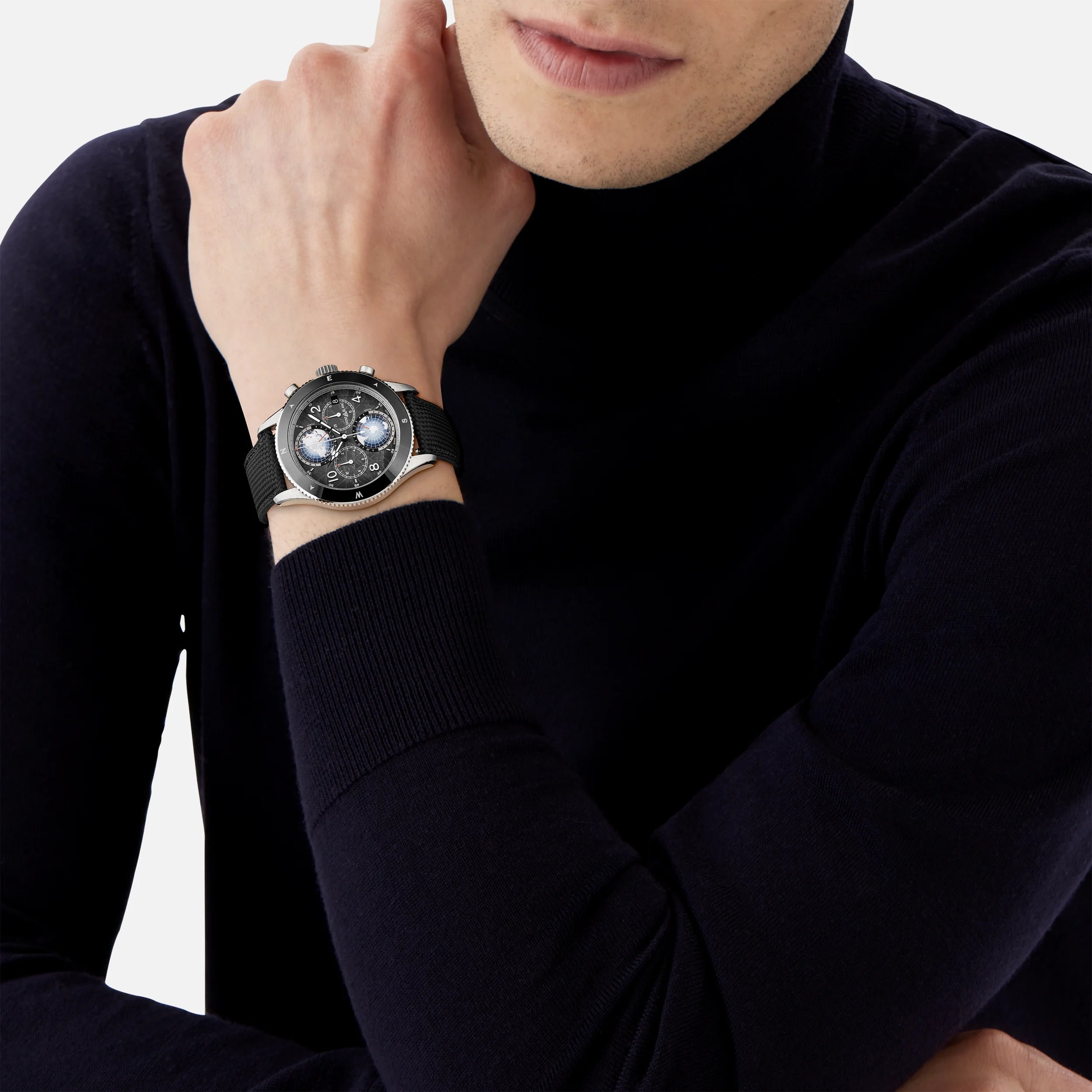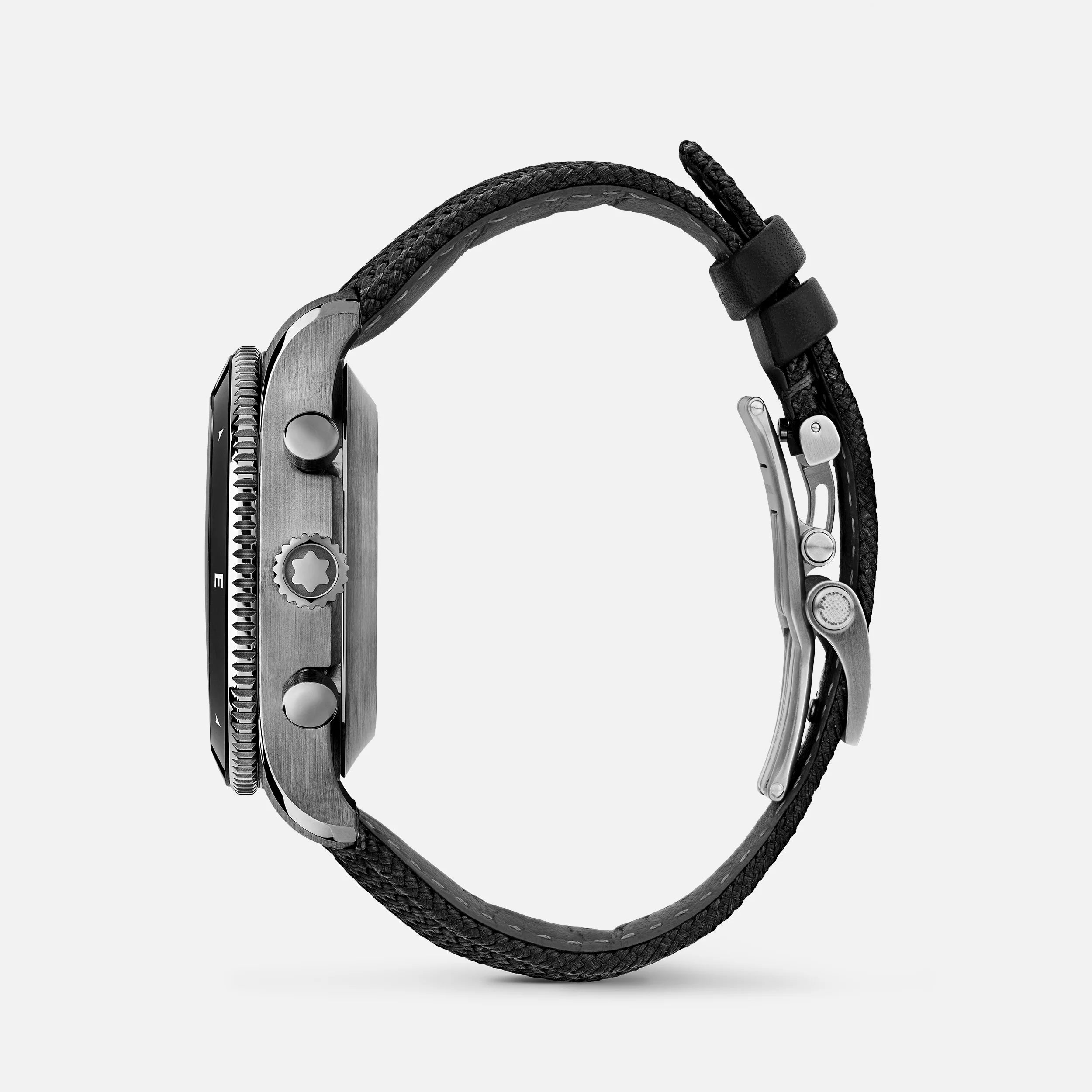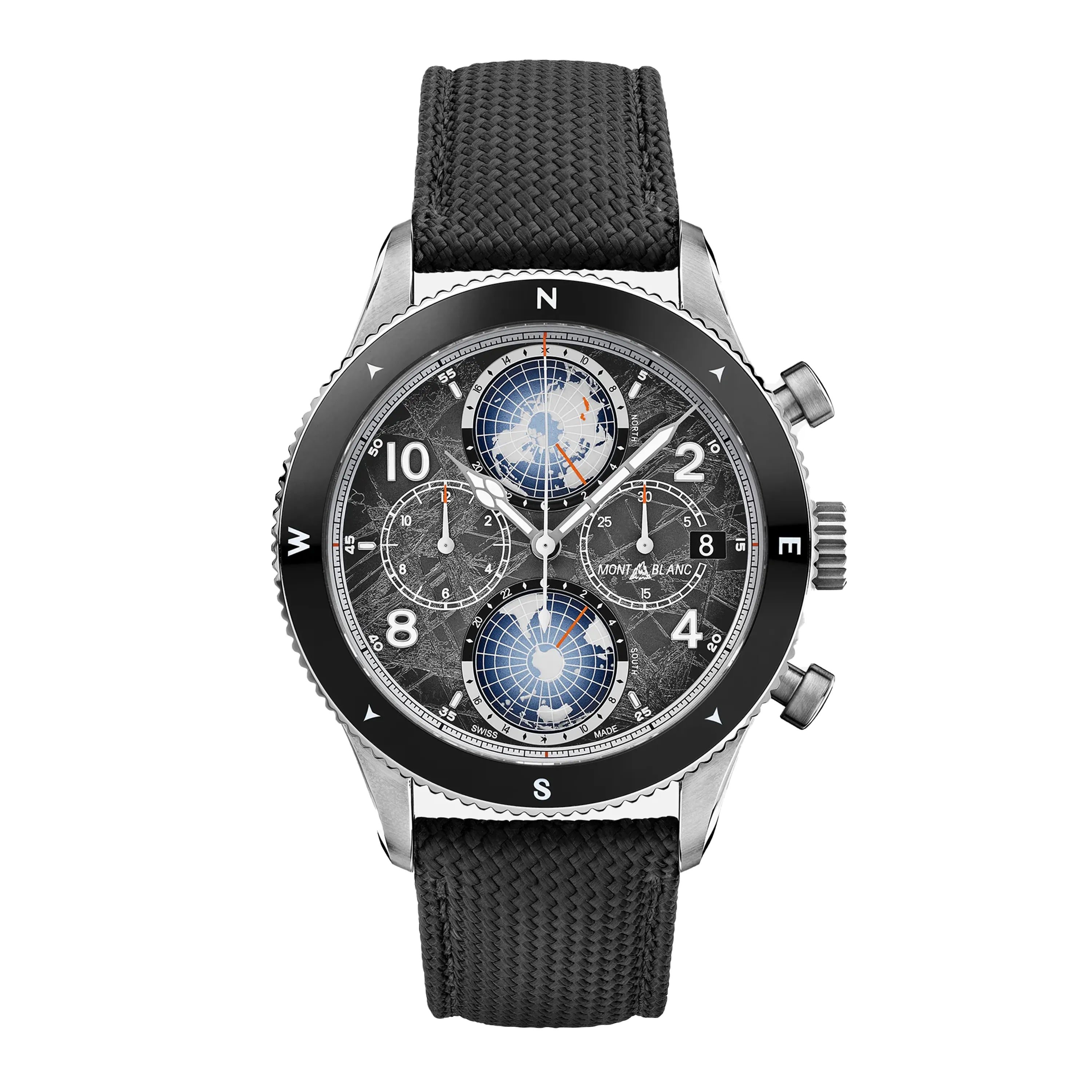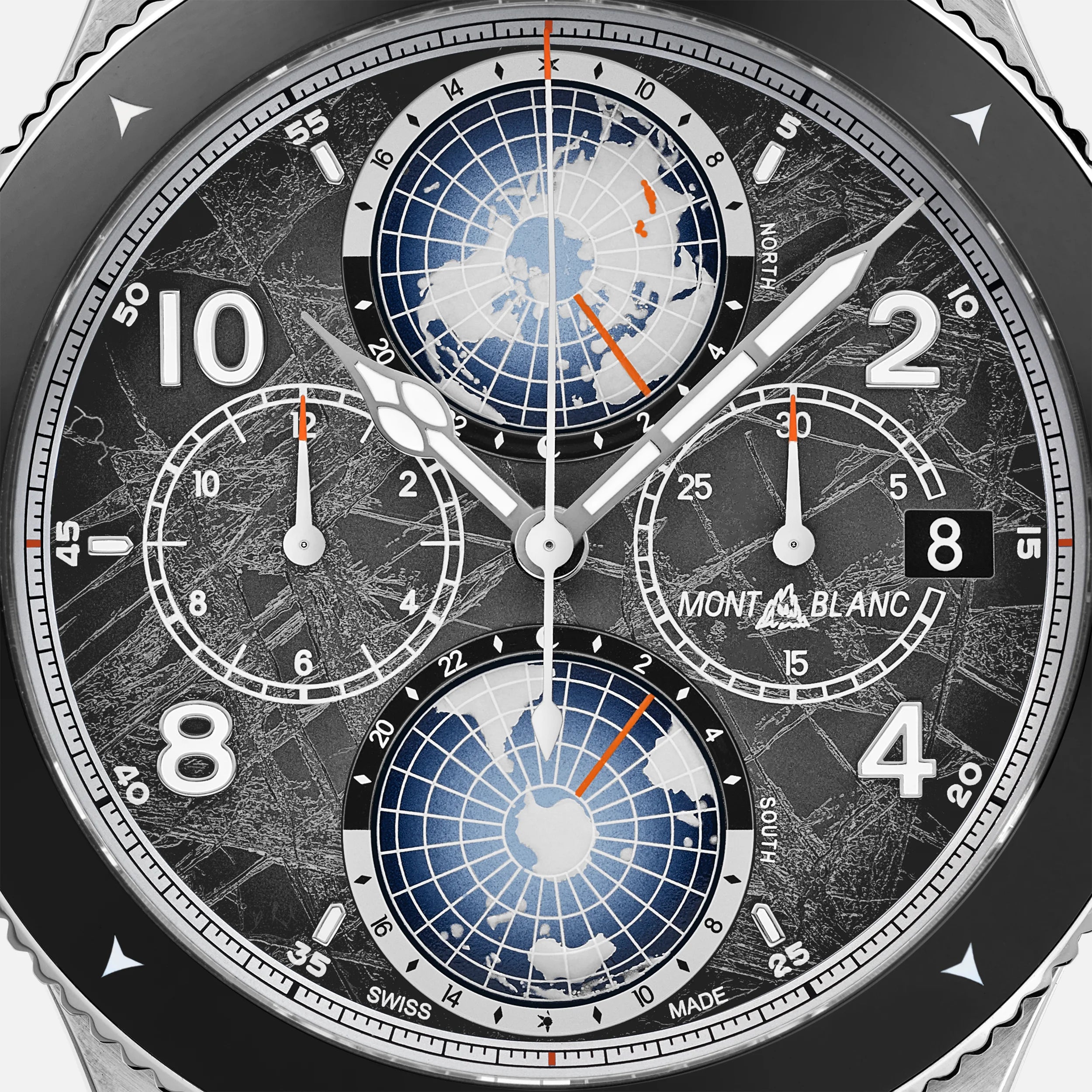 Paying tribute to the world’s highest peaks and the alpinists who dare to climb them enduring extreme conditions, the Montblanc 1858 Geosphere Chronograph 0 Oxygen The 8000 Limited Edition to 290 pieces is housed in a 44mm titanium case totally devoid of oxygen. This has several advantages for explorers by eliminating fogging and preventing oxidization, thus allowing the movement to last far longer with greater precision. Powered by Montblanc’s Manufacture Chronograph with Worldtime complication, Caliber MB 29.27, this automatic movement includes a date at 3 o’clock and two 3D turning globes with the Northern Hemisphere at 12 o’clock and the Southern Hemisphere at six o’clock. Both hemispheres feature orange reference meridians, 14 dots marking the 8000m peaks on the northern continents, and day & night indicators. The timepiece also comes fitted with a fluted bi-directional black ceramic bezel with cardinal points and a 3D colored laser engraving on the case back displaying names and altitudes of the14 eight-thousanders. The dial and bezel luminescent indications are very practical for any outdoor adventures.