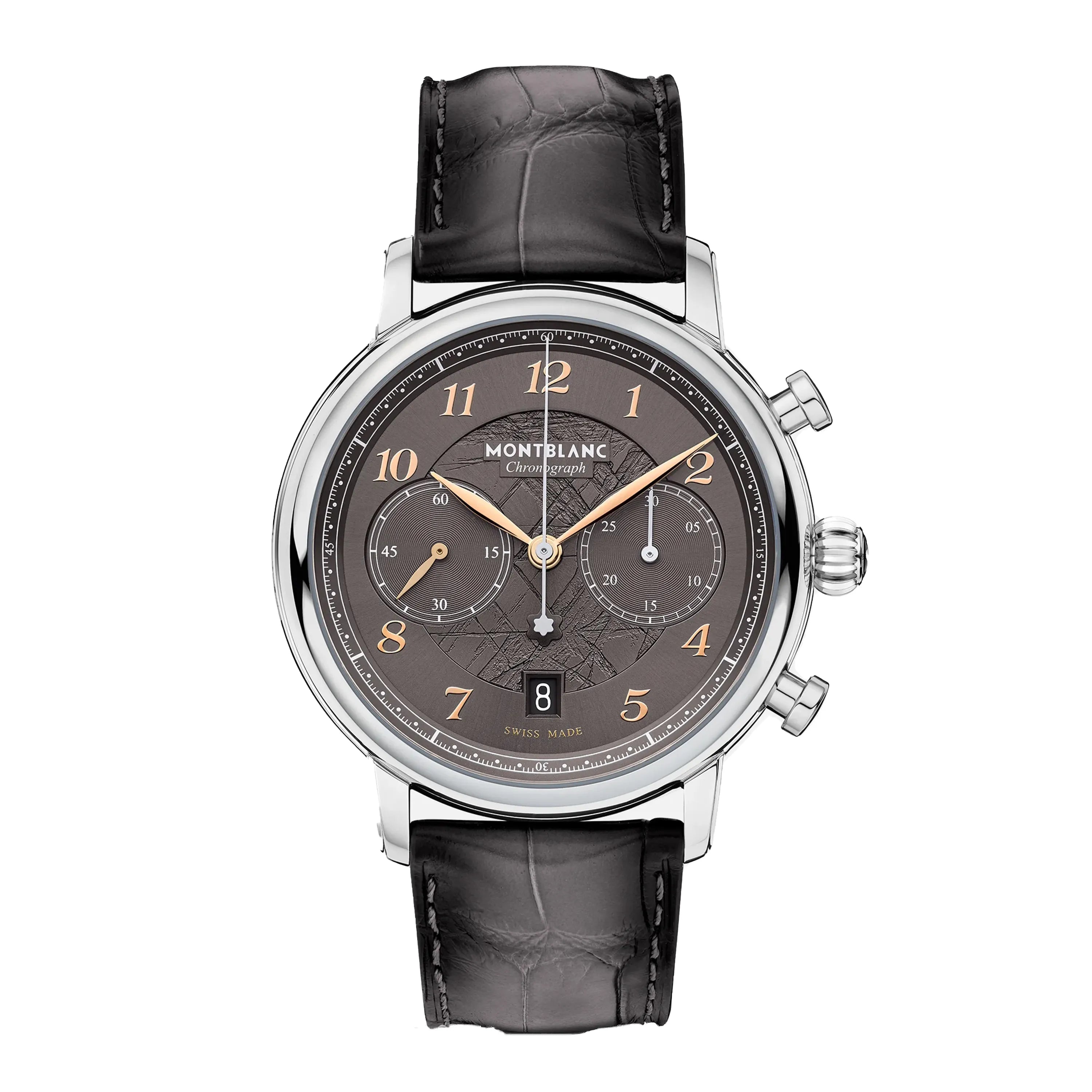 The Montblanc Star Legacy Chronograph Limited Edition of 1786 pieces comes in a 42mm stainless steel case that highlights a new facet of the Mont Blanc – its south-facing rocky side. This timepiece comes with two chronograph counters at three and nine o’clock for an elegant look and important legibility. The gray glacier pattern can be perceived in the background, while the filet sauté has been replaced with an inner flange to bring volume to the dial. The time functions are displayed with rose-gold coated, leaf-shaped hands, while the chronograph indications use rhodium-coated “baton” hands. The timepiece comes on an interchangeable gray calf leather strap with an alligator print.