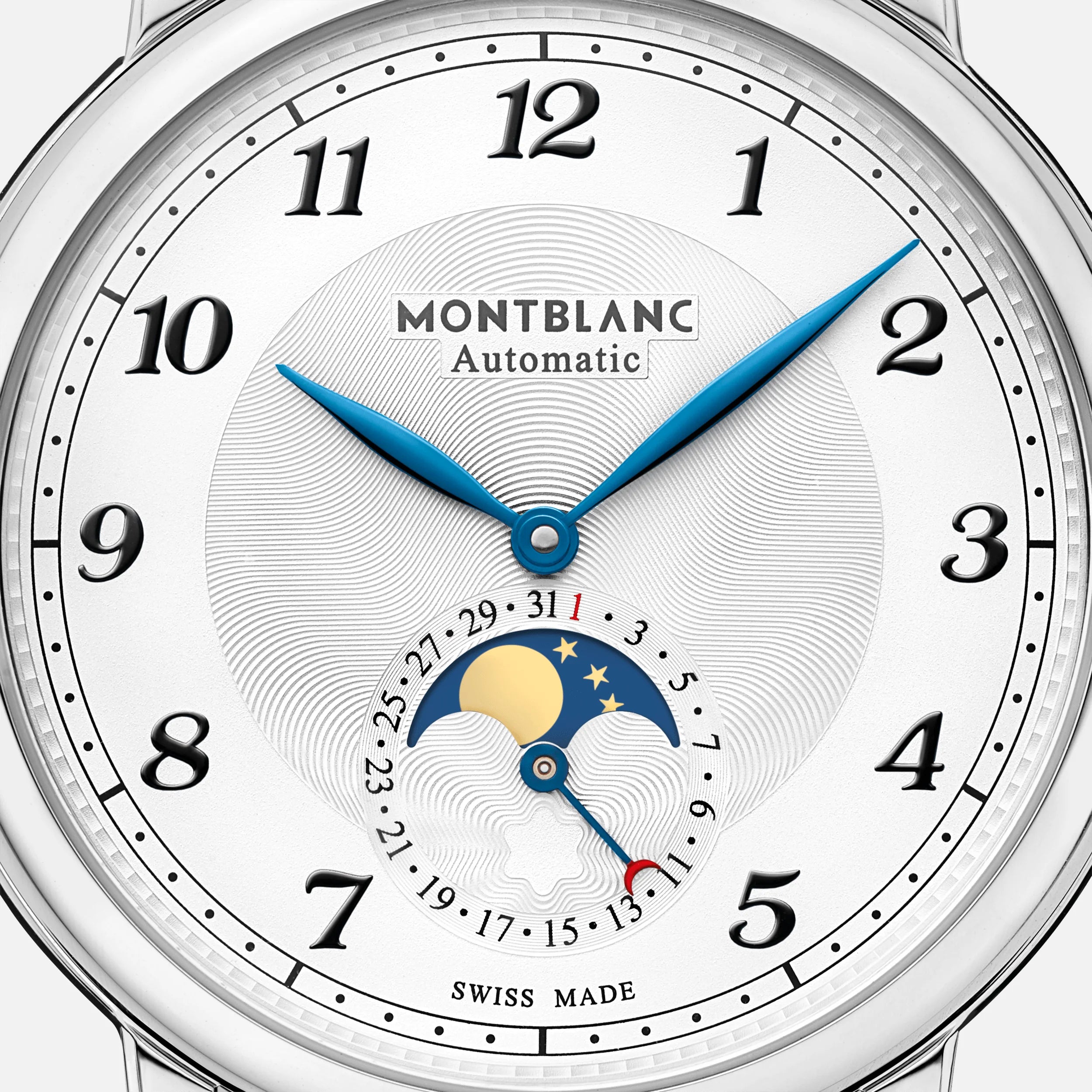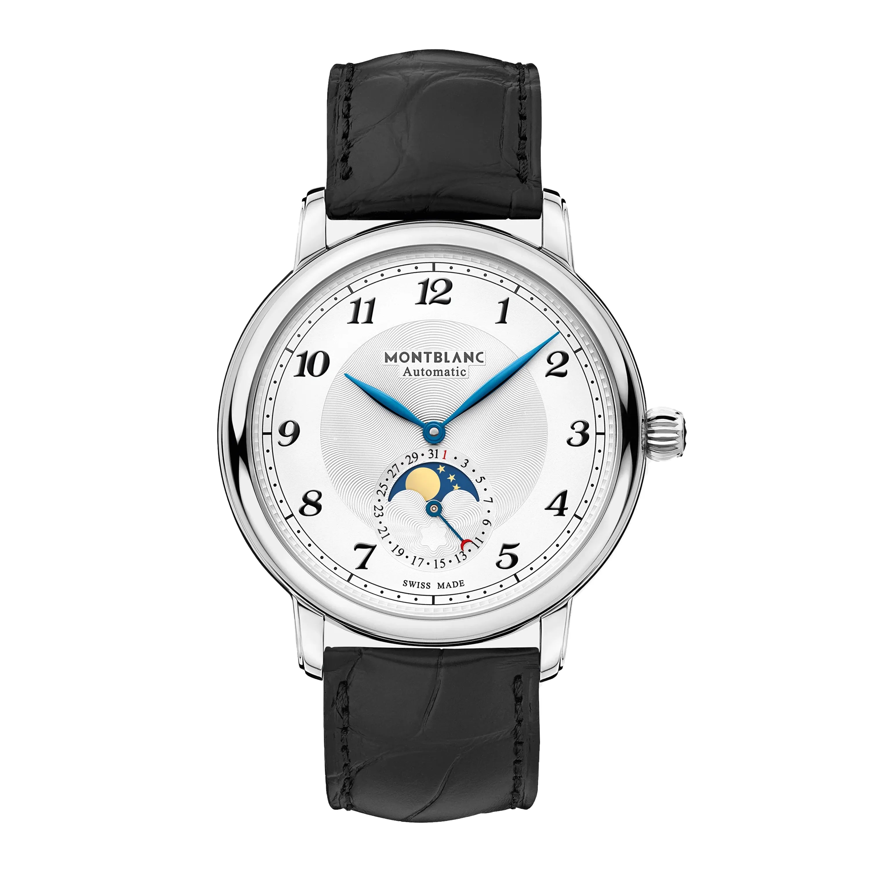 Montblanc reinvents its iconic Star Collection with aesthetic design codes that are directly rooted in the history of traditional fine watchmaking and the extraordinary Minerva heritage. With its pure lines, the Montblanc Star Legacy Moonphase features a refined moonphase complication, which is highly appreciated by watch aficionados for its utility, technical prowess and beauty. Displayed in an aperture at 6 o’clock, the moonphase combined with a date brings elegant and refined proportions to the dial. Respecting the Star Legacy design codes, the timepiece features elegant leaf-shaped hands, the Montblanc iconic exploding star guilloché pattern on a silvery-white dial, onion-shaped crown, a unique railway minute track, filet sauté (up and down guilloché lines) and redesigned Breguet-style Arabic numerals reminiscent of the historical Minerva pocket watches. The timepiece is housed in a 42 mm round stainless steel case which features refined curved horns with distinctive facets, and comes with a black alligator leather strap crafted by the Montblanc Pelletteria in Florence, Italy.