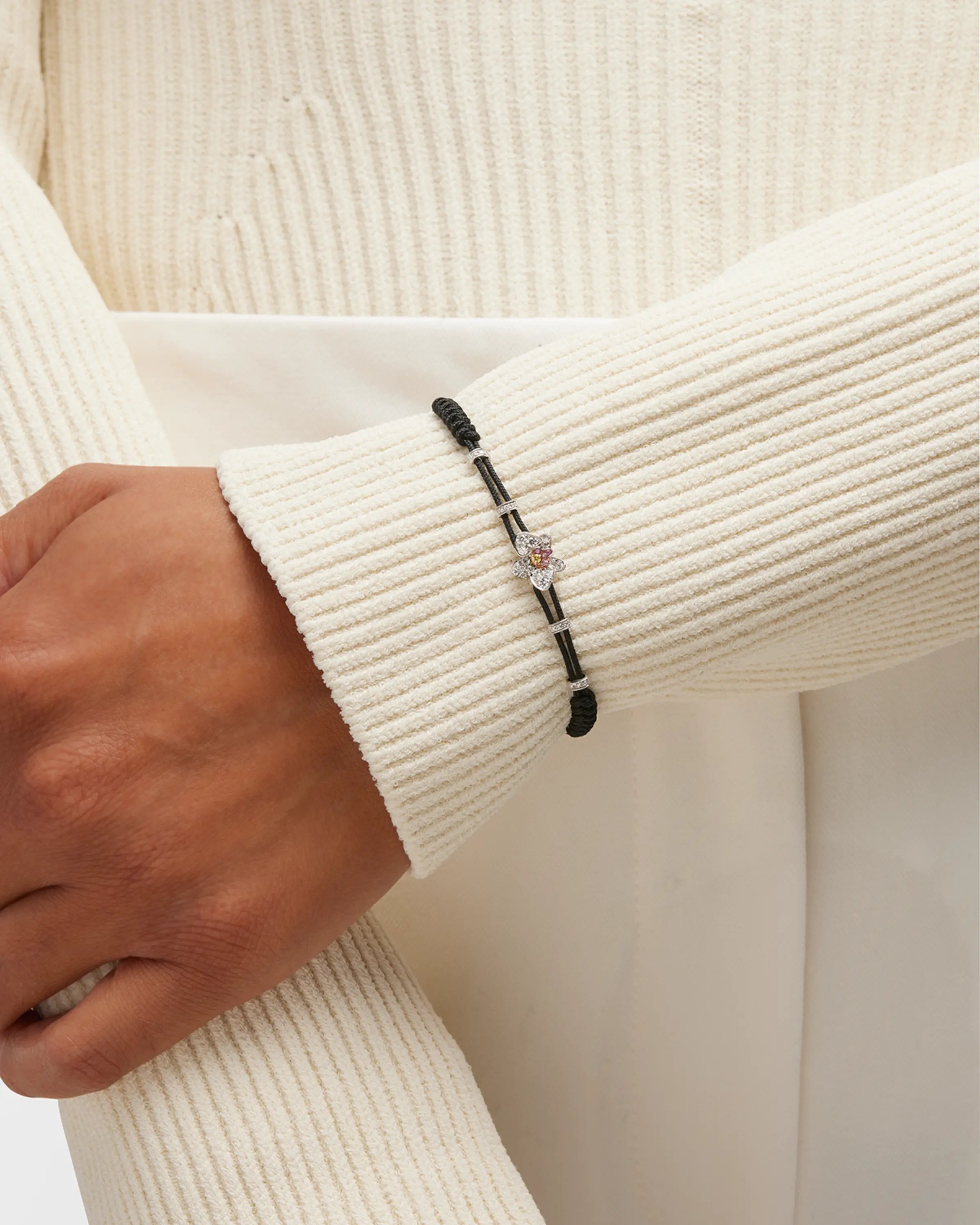 18K White Gold, adjustable black nautical cord. Pippo Perez’s jewelry creations are crafted from gold and precious stones. Perez’s innovative and symbolic stylistic trait evokes memories, passions and Mediterranean scents to be enjoyed day after day. The excellent Italian Craftmanship is a guarantee of uniqueness and quality. Past and present intertwine in a dream that comes true every single day.