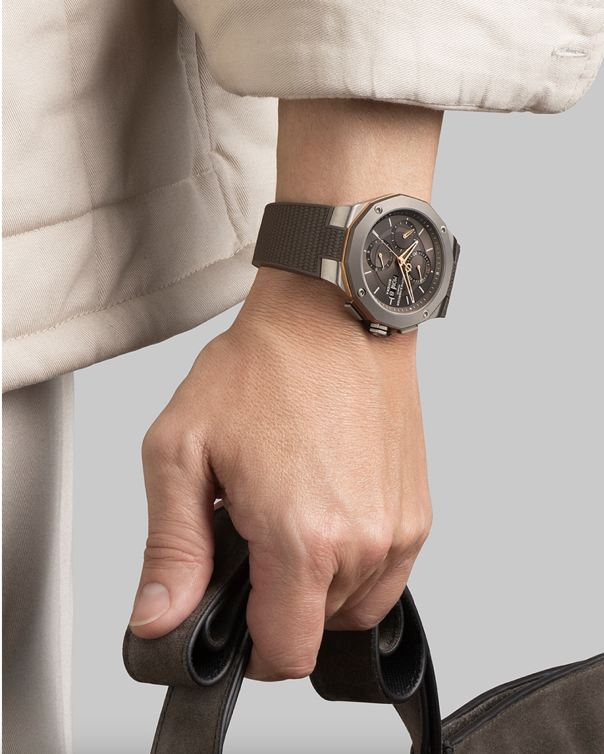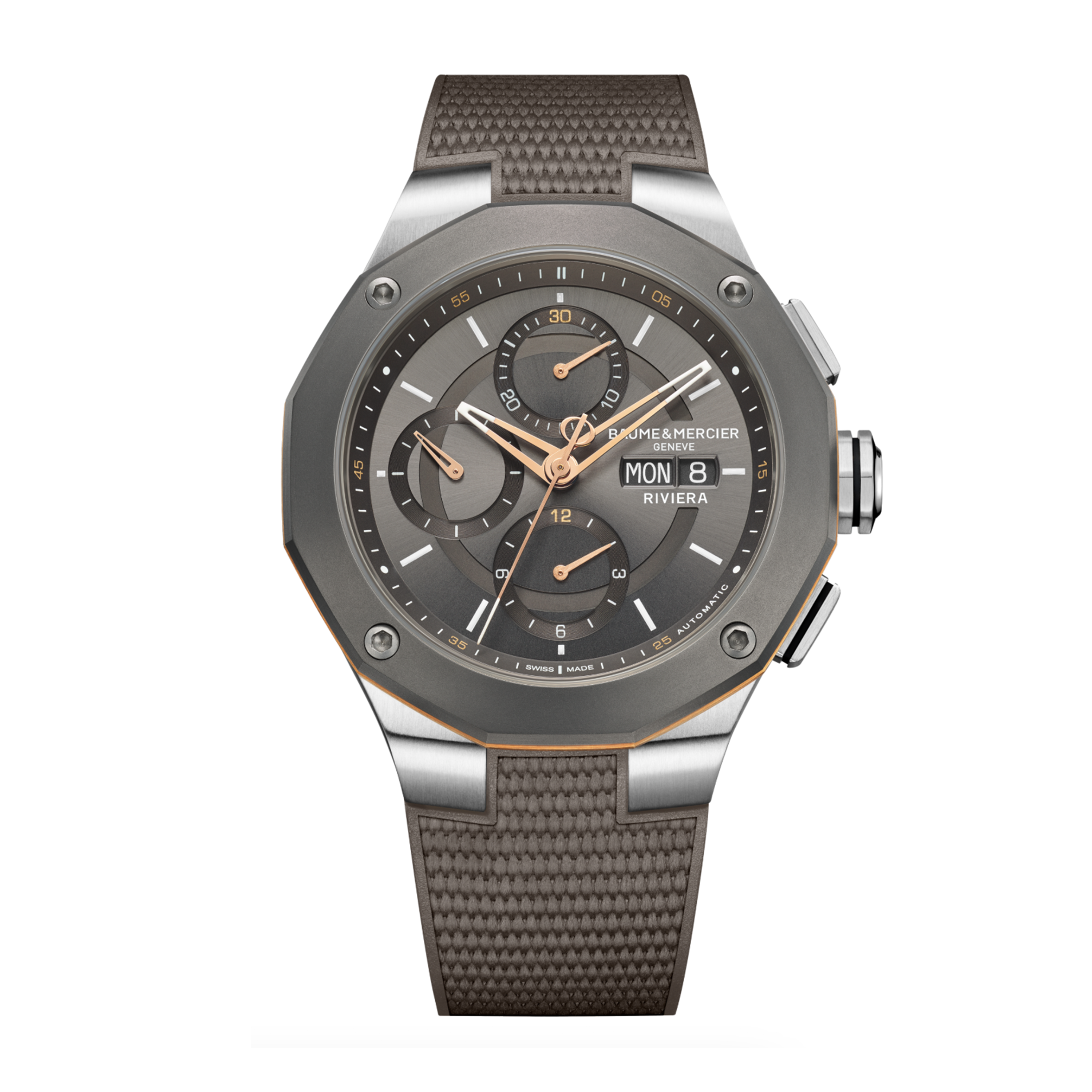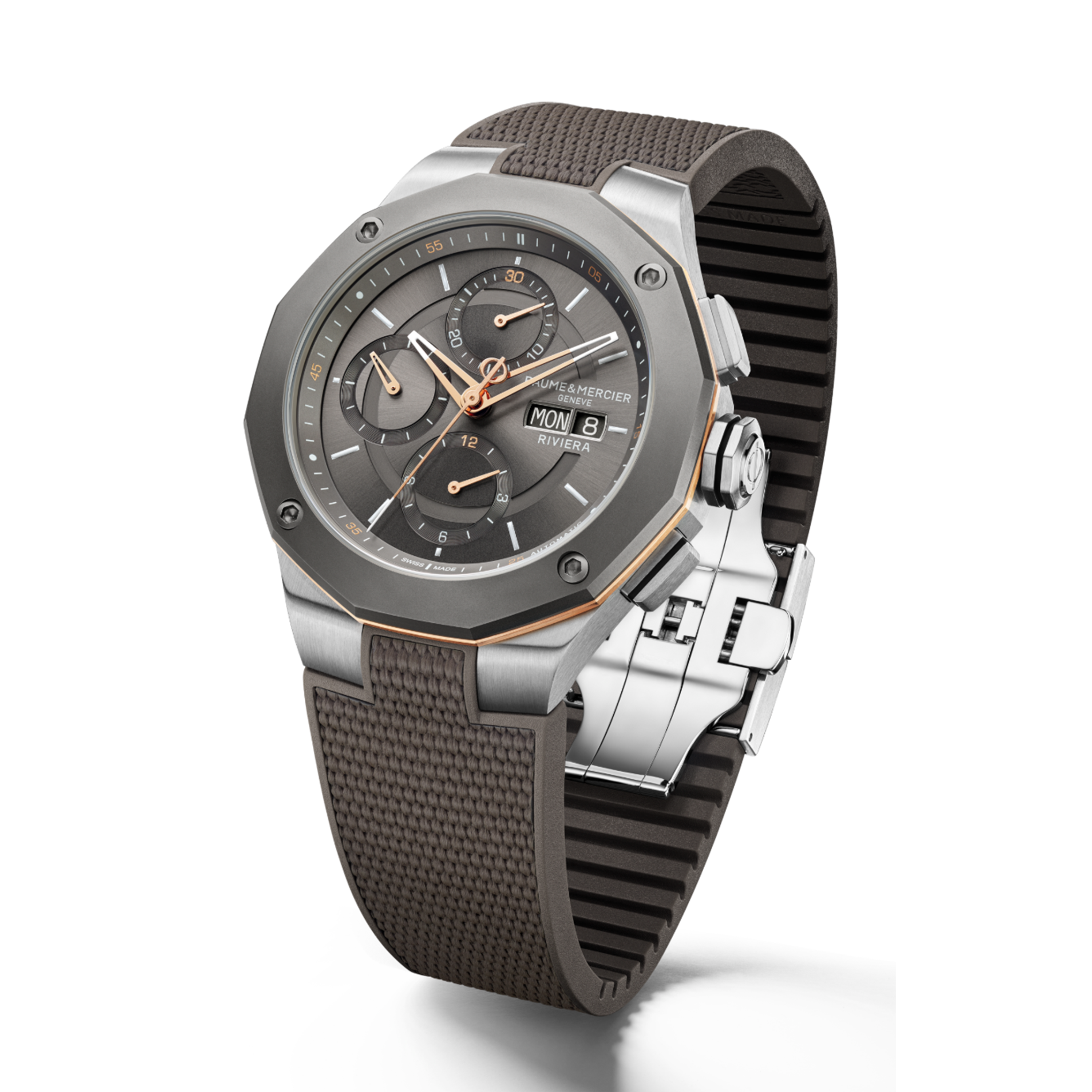 Equipped with a Valjoux automatic movement, this Riviera features a sun satin-finished slate-grey dial and a gray rubber strap with canvas decoration. Featuring a sandblasted titanium bezel enlighted by a PVD gold ring, this timepiece is perfectly in keeping with the Maison's chronograph tradition.