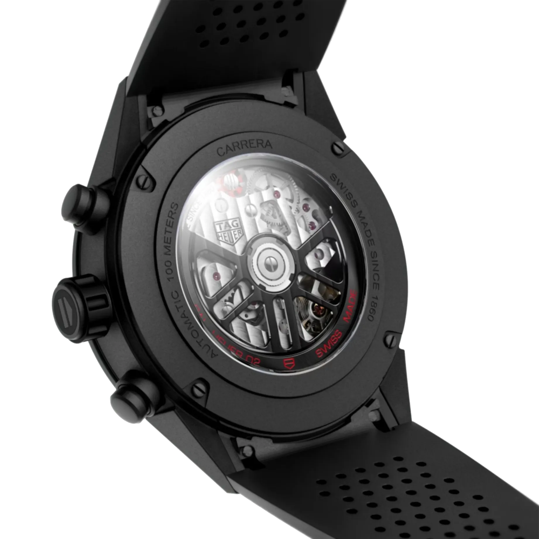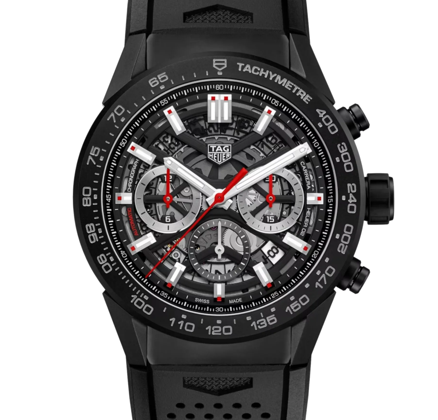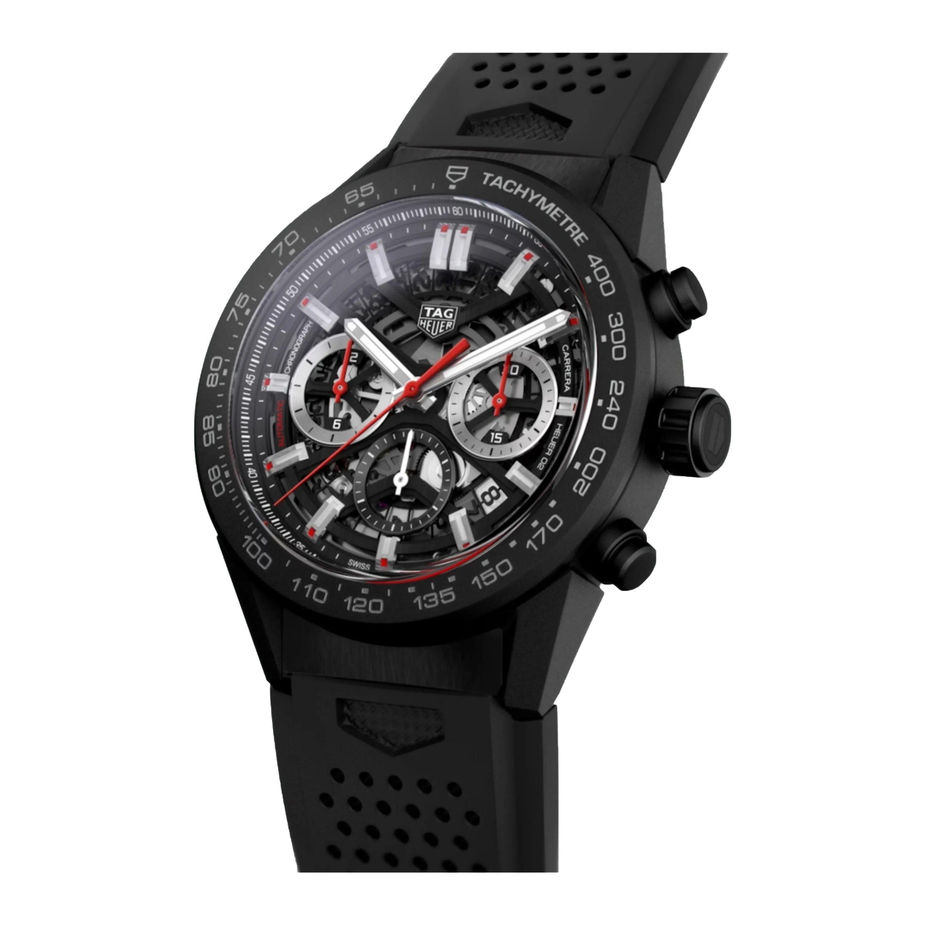 A black 45mm automatic chronograph true to the TAG Heuer Carrera’s unique roots in motor-racing. Original counter positioning at 3-6-9 dial adorns the skeletonized dial. Sporty rubber strap. The manufacture automatic movement Heuer 02 provide you with a stunning 80 hours power reserve.