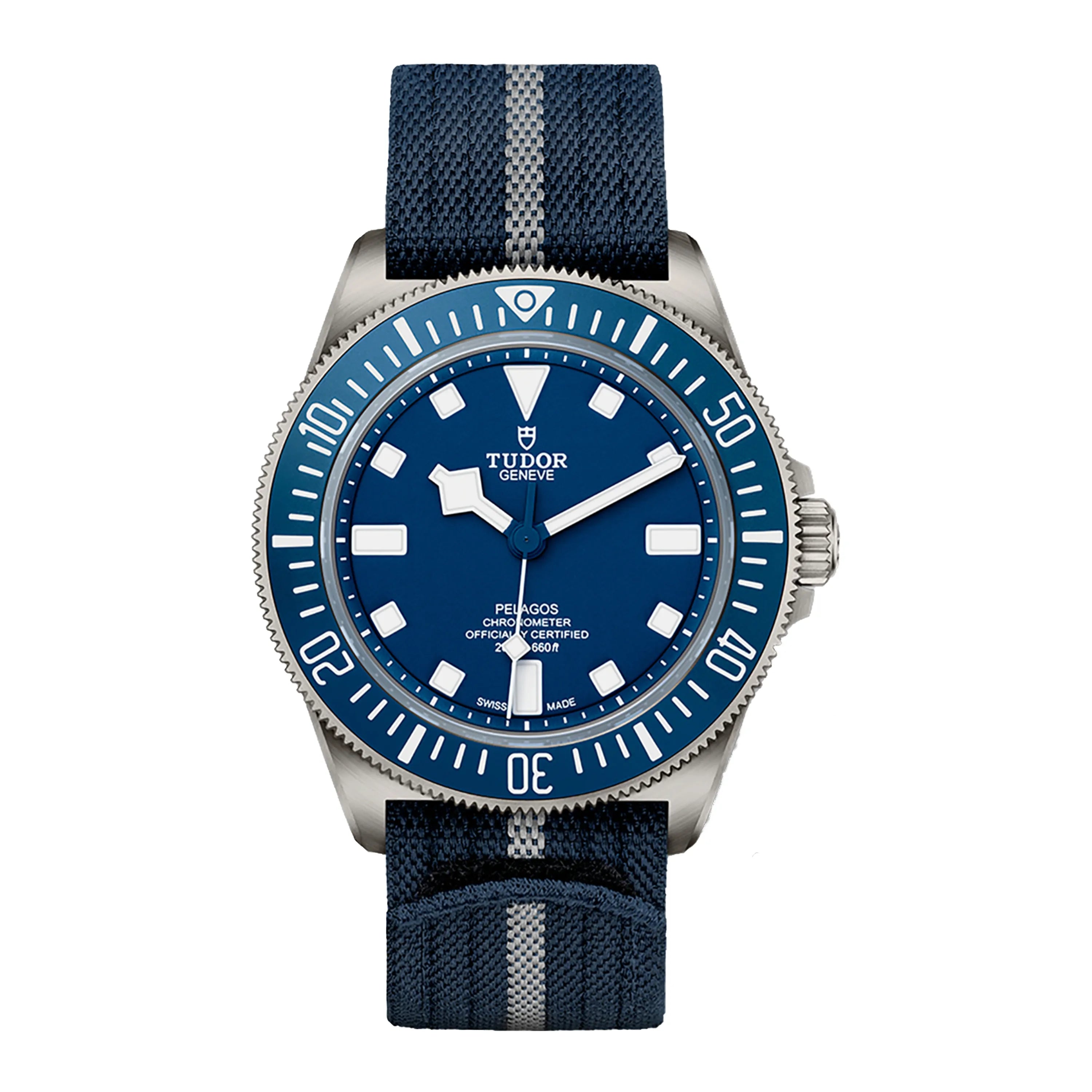 | Strap & Buckle | Fabric strap with self-gripping fastening system, navy blue with grey central thread. + Additional navy blue rubber strap with woven motif and titanium buckle, included in the box |